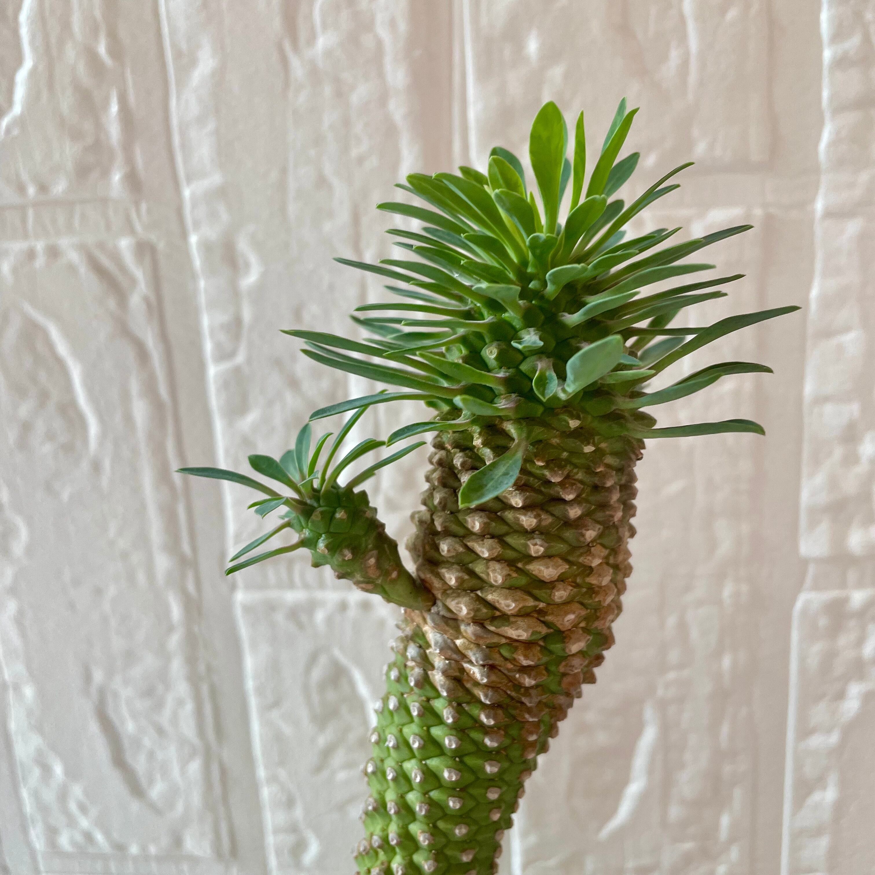 丸い幹に小さな葉を茂らせる姿が可愛らしい、ユーフォルビア・パイナップルコーン。